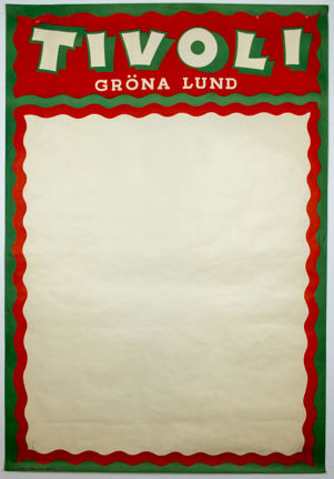 Affisch tryckt i rött och grönt som en inramning utan innehåll med text längst upp. På affischen står: Tivoli Gröna Lund