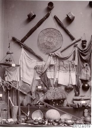 Fotografi från en utställning på Konstakademien år 1900. Bilden visar föremål från från El Salvador och Guatemala, bland annat husgeråd och dansmasker.