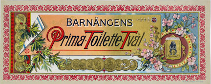 Etikett till tvålkartong tryckt i flera färger, med medaljonger och växter samt text. På etiketten står:Barnängens Prima Toilette Tvål.