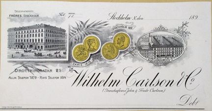 Fakturahuvud i svart och guld med bild på affärslokal, medaljer samt text. På trycket står: Wilhelm Carlson & Co, Drottninggatan 21 och Humlegårdsgatan 17, Stockholm.