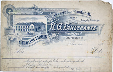 Brevhuvud tryckt i svart med bild på fabrikexteriör, dekor samt text. På trycket står: A. G. Fahlcrantz Spegel och Ramfabrik. Sturegatan 14.