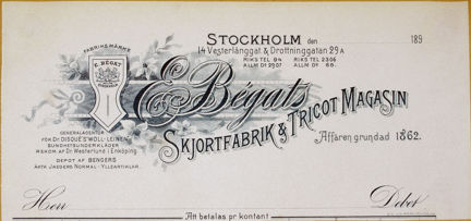 Brevhuvud. E. Bégats Skjortfabrik & Tricot Magasin