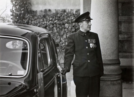 Erik Lund var prins Eugens chaufför under mer än 20 år. Här står han framför huvudentrén till Slottet, prins Eugens hem på Waldemarsudde. Lund är klädd i sin chaufförsuniform och står redo att öppna bilens bakdörr för prinsen.