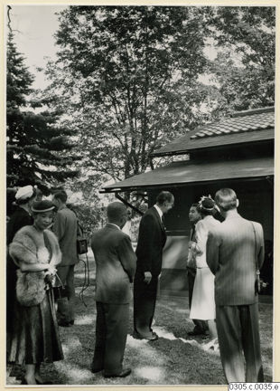 Japans unge kronprins Akihito (1933-) var på statsbesök i Sverige 1953. Fotografiet är taget den 18 augusti när han och hans uppvaktning besökte det gamla japanska tehuset intill Etnografiska museet. Det hade byggts där 1935 och brann ner 1969. Idag är det ersatt av ett nytt tehus, Zui-Ki-Tei som byggdes 1990. Där anordnas teceremonier, och runt huset finns en japansk trädgård.