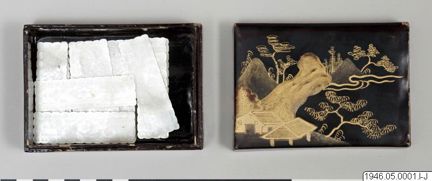Den här kinesiska lackasken innehåller fem mindre askar med samma slags dekor. I var och en finns spelmarker i skimrande pärlemor. Alltsammans är tillverkat i södra Kina kring mitten på 1700-talet. Det kommer ifrån en verkstad som tillverkade saker för den europeiska marknaden, för sådana här marker används inte i kinesiska spel.