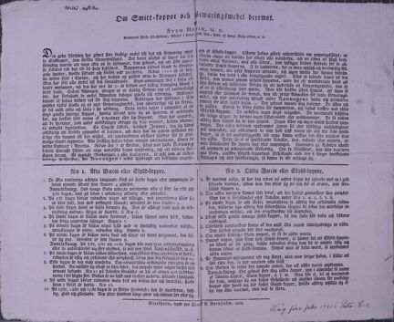 Den goda försynen har gifwit flere kraftige medel till bot och förwaring emot de Sjukdomar, som föröda Menniskoslägtet. Det beror således af Hwar och En förnuftig warelse att noga akta på de lärdomar, som gifwas, och att söka upplyste Läkares råd den tid då hielp behöfwes. Kopporna räknas bland de förfärligaste smittor, hwilka härjadt och förödt wår werldsdel. Sedan 1200 år är denna smitta känd i Europa. Och har blifwit oss påförd ifrån de Warmare luftstrek. Man har sökt alla medel till dess förmildrande. Kopp-ympningen blef i detta afseende uppfunnen, och den har mer än 50 år blifwit med lycklig framgång öfwad i wårt Land. Endast Allmogen, itagen af en skadlig fördom om ett oundwikeligt öde, har den förkastadt de medel Allmakten behagat utpeka till räddning. Millioner tusende lif hafwa blifwit rof för Pest-kopporna. Ändteligen har Försynen i Sin mildhet täckts skänka oss ett nytt förwaringsmedel, som owärderligt till sin fördel, är det mäst enkla och lätta i sin utöfning. Detta medel består i ympandet af ett slags ganska lindriga koppor, hwilka tidtals wisa sig på spenarene av mjölkande kor, och derföre fådt namn av vacciner eller ko-koppor. Man har anmärkt att de personer, som under mjölkningen ådragit sig desse vacciner, hafwa sedermera undgådt koppsmittan. En Engelsk Läkare, benämnd Jenner, tog sig häraf anledning att försöka ympandet av vaccinen, och man har nu genom millioner pålitlige rön kommit till den wishet, att vaccinationen ofelbart skyddar för de grufweliga Smitt-kopporna. Alla Folkslag hafwa redan antagit vaccianationen, äfwen de wilda Nationer i America. Redan äro 7 år förlidne, sedan wår hulde Konung befaldt Swenske Läkare att noga undersöka denna uppfinning, och att utredan kunskapens beröm. Åt upplyste Medborgare i alla Landsorter, så wäl som åt Rikets wördiga prästerskap, hur Konungen i nåder uppdragit att befrämja ympningen af Skydd-koppor.