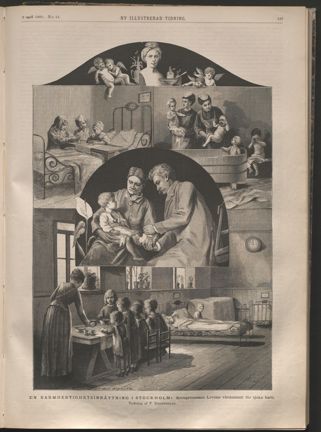 Här illustreras verksamheten vid Kronprinsessan Lovisas Vårdanstalt för sjuka barn på Kungsholmen. Konstnären har tecknat de små patienterna, en läkare, sköterskor och miljön i en sjuksal. Barnsjukhuset öppnade 1854 och låg vid Hantverkargatan 14A fram till 1899.