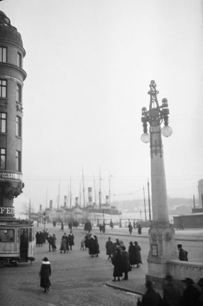 Bakom en spårvagn skymtar Feiths konditori. Feiths hade flera serveringsställen i Stockholm. Det på Strandvägen 1 öppnade 1904 och beskrevs så här i Svenska Dagbladet: ”Ett stort damcafé i 1-ans souterrainvåning, rymligt, dyrbart och elegant inrett som det höfves en samlingsplats för den fina världens damer".