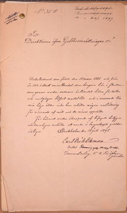 Undertecknad som född den 11 mars 1835 och från 1858 idkat minuthandel som borgare här i staden men genom under sednare årtiondet lidna förluster och motgångar blifvit medellös och i anseende till min höga ålder icke kan erhålla någon anställning för vinnande af mitt och de minas uppehälle får härmed under åberopande af bifogade betygen vördsamligen anhålla att varda å borgerskapets gubbhus intagen