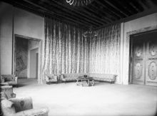 Skissen är signerad av textilkonstnären Maja Sjöström och mönstret kallades ”Fästens genier”. Det var tänkt till gardiner i festsalen Gyllene salen, men användes sedan till väggdraperier i Salen Tre kronor. Draperierna tillverkades av sidenväveriet Luigi Bevilacqua i Italien och kallades där ”Angeli” (änglar).