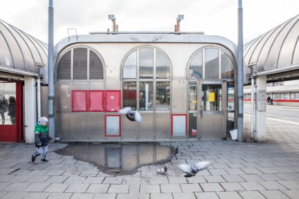 Gullmarsplans busshållplats, byggnad med fönster och dörr i plåt. Duvor flyger iväg, ett barn går förbi