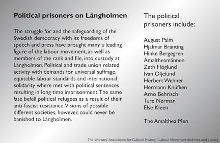 Kampen för och värnandet av den svenska demokratin med dess yttrande- och tryckfrihet har fört många av arbetarrörelsens ledande företrädare med också medlemmar ur de djupa leden till fängsligt förvar på Långholmen.
