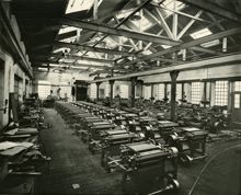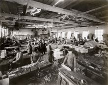 Interiör från snickeriavdelning på Bolinders mekaniska verkstad kring år 1900. Bild ur Bolinders mekaniska verkstads historiska arkiv hos Centrum för Näringslivshistoria.