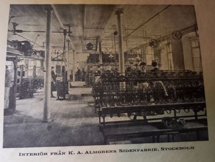 I bildens mitt står en barnarbetare och kör en spolmaskin. I fabrikens tak syns remdrift som driver maskinerna, remdriften installerades 1881. Precis som i andra industrier i början av 1900-talet var de anställda på Almgrens sidenväveri specialiserade på en bestämd syssla som de arbetade med.