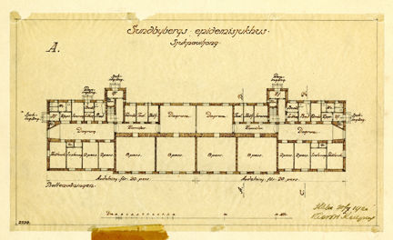 Sundbybergs epidemisjukhus, sjukpaviljong. Planritning över bottenvåningen.