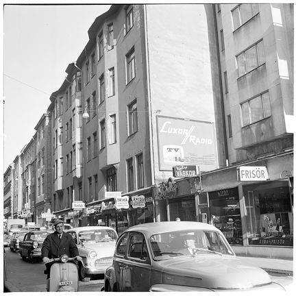 Grev Turegatan norrut från nr 8. Bilar och en scoter