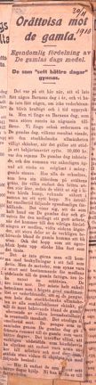 ”Det otroliga är emellertid sant. De pengar som insamlades genom De gamlas dag gå i främsta rummet till gamla som ’sett bättre dagar’. Det inträffar alltså, att verkligen nödställda som händelsevis ha olyckan att endast vara arma änkor till arbetare och med dem jämställda utan vidare få ohjälpta gå med följande besked: - Här får endast de som förut sett bättre dagar hjälp. Ni kan hålla er till fattigvården.”