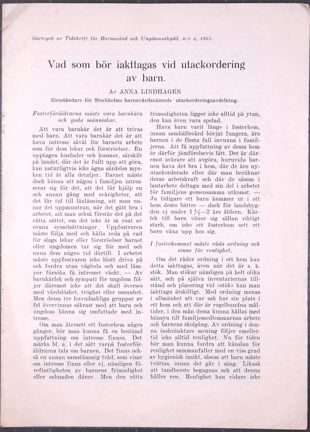 Anna Lindhagen (1870-1941) var en socialdemokratisk politiker som var verksam inom en rad olika områden. Hon var utbildad sjuksköterska och arbetade aktivt för barns rättigheter, bland annat genom att inspektera fosterhem och se till att de var lämpliga för barn. 1931, när artikeln skrevs, var hon föreståndare för Stockholms barnavårdsnämnds utackorderingsavdelning.