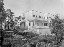 Huset har tre plan – bottenplan med terrass, våning 1 trappa upp med hörnbalkong och vindsplan med takterrass – samt källare med två garage. Exteriören visar typiska stildrag från funktionalismen; uppbyggnaden med enkla geometriska grundformer, ljusa odekorerade fasader och stora fönster vars form och placering avspeglar den inre planlösningen.