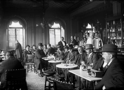 Interiörbild med gäster från Rydbergs bar tagen i samband med att baren stängdes den 30 september 1914.