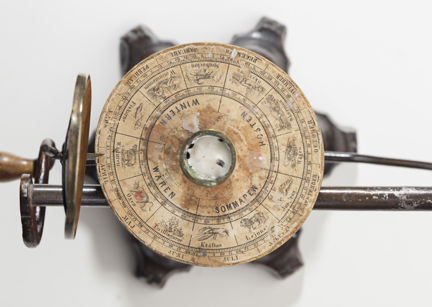 Tellurium som har använts på Hedvig Eleonora folkskola. Monterat på ett gjutjärnsstativ målat i brunt med sex fötter avsedd för stearinljusbelysning. Tillverkad i Tyskland 1868.