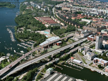 Förbipasserande och arbetare vid byggställningar under byggandet av Skanstullsbron. Byggandet av bron påbörjades 1944, men andra världskriget fördröjde arbetena. Brons spårdel öppnades för trafik den 3 september 1946. De första åren trafikerades den av spårvagnar fram till dess trafiken med tunnelbanetåg påbörjades den 1 oktober 1950. Den parallellt löpande vägbron öppnades ett drygt år senare, den 28 september 1947.