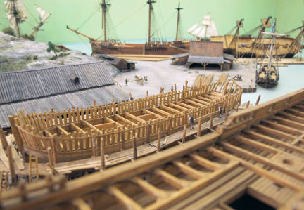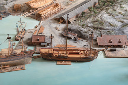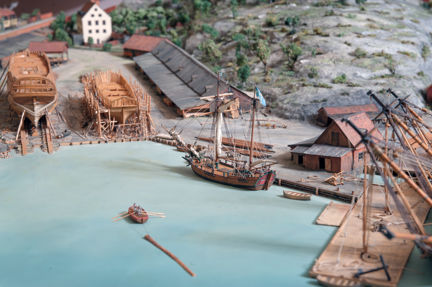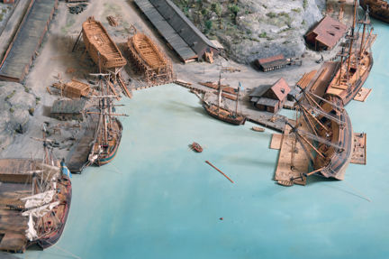 I modellens mitt finns två fartyg under byggnad på stapelbäddar. När skroven är färdiga kommer de att sjösättas, något som i äldre tid kallades för stapelavlöpning. Vid kajen i Tegelviken ligger bland annat en galeas, ett mindre tvåmastat handelsfartyg. I viken bogseras ett masttimmer av en roddbåt.