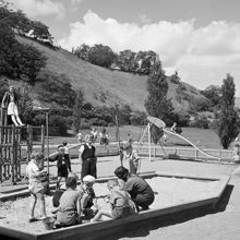 Skissen till "Klätterpyramid av trädstammar för större sandlådor och sandlekplatser" ritades för parkavdelningen 1940. Klättertornet är uppbyggt av stockar i olika höjd. På skissen syns också fem lekande barn.