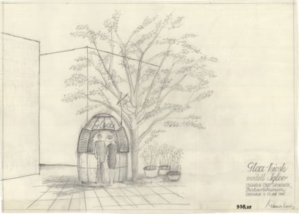 Perspektivskissen till "Glace-kiosk modell Igloo" är signerad av arkitekt Gunnar Larsén. Den lilla byggnaden är kupolformad som en igloo och ytterväggarna är indelade som isblock.