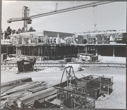 Fotografiet visar Tensta gymnasium under uppbyggnaden. Skolbyggnaden, som har ritats av arkitekten Gösta Uddén (1927-2017), byggdes i en blandning av modernism och asiatisk arkitektur. Till exempel fanns det inplanerat en vinterträdgård i bottenvåningen, glasade väggar, balkonger och en frodig park utanför.