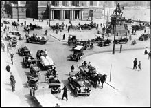 Här på Gustav Adolfs torg är Kungliga operans byggnad i gul ockra den självklara mittpunkten. När bilden målas är det sent 1890-tal och på torget samsas både människor som promenerar, hästdroskor och spårvagnar.