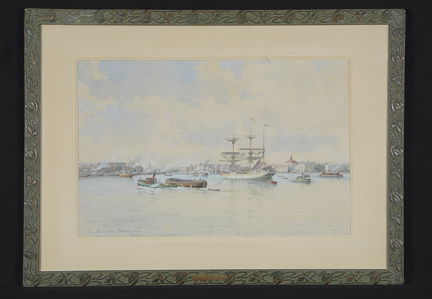 Målningen visar en vattenutsikt med utsikt över Gamla stan och Slottet, Blasieholmen och Skeppsholmen. Anna Palm var en mycket omtyckt konstnär i slutet av 1800-talet och hon gjorde ofta målningar med stadsvyer från Stockholm.