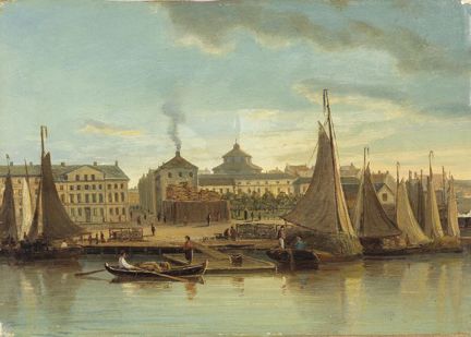 Ladugårdslands strandgata med Kronobageriet, Källaren Flaggen och Östermalmskyrkan i bakgrunden