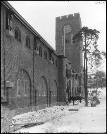 Stockholms Stadion vintertid med Klocktornet mot Sturevägen (nuv. Lidingövägen).