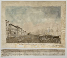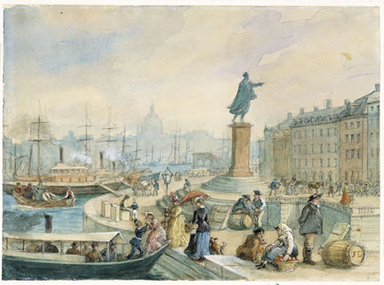 Skeppsbron nedanför Gustav III:s staty var tilläggsplatsen för den reguljära båttrafiken över Strömmen. Härfrån kunde stockholmarna ta båten bland annat till Nationalmuseum. Fritz von Dardel har skildat passagerare som går ombord på en ångslup. Det är elegant klädda damer med sällskapshundar. Vi ser även personer med varor som ska fraktas med båt.