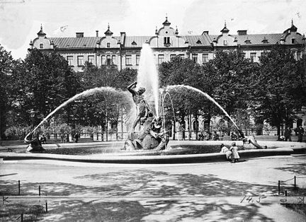 Skulpturen Tors fiske, av A.H. Wissler. Adolf Fredriks torg sett mot kv. Rosendal Mindre