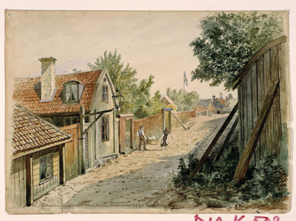 Här ser vi en relativt idyllisk gatuvy av konstnären Fritz Ahlgrensson som vid sekelskiftet 1900 skildrade trähusbebyggelsen på Södermalm. Flera av de akvareller som Stadsmuseet har i sina samlingar visar betydligt mer fallfärdiga hus.