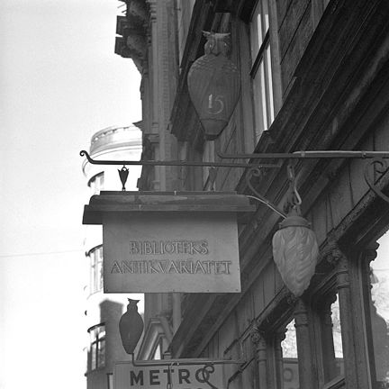 Storgatan 15. Biblioteksantikvariatet, skylt