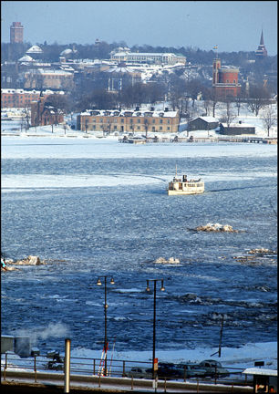 Utsikt över Saltsjön med färjan Bore, Skeppsholmen och Kastellholmen i fonden, vinterbild