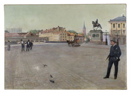 Gustav Adolfs torg en tidig morgon 1891. Några män rumlar hem från krogen. En av dem sträcker sig mot en kvinna i ett försök till kontakt. Den andre drar honom till sig för att gå. I förgrunden står en man klädd i svart med hatt och paraply. Det är författaren och teaterkritikern Daniel Fallström (1858-1937) som fundersamt tittar på några fåglar.
