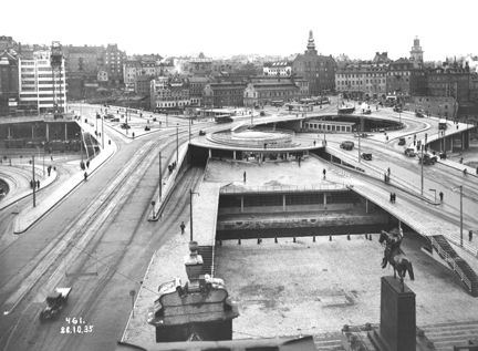 Slussens trafikmaskineri sett mot Södermalm. I mitten på bilden Södra Stadshuset, Stockholms Stadsmuseums byggnad