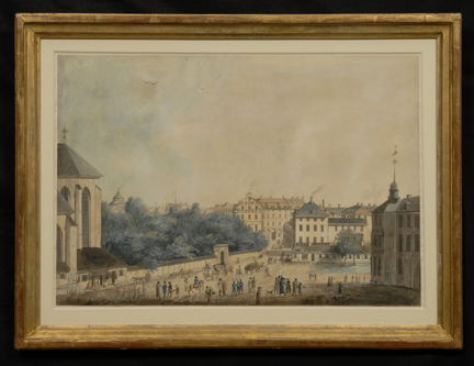 Här ser vi Arsenalsgatan och platsen utanför Arsenalsteatern. Det är livligt, många människor rör sig i området. Lägg märke till att Kungsträdgården ännu var omgärdad av en mur. Denna togs bort på 1820-talet. Byggnaden till vänster är Jakobs kyrka.