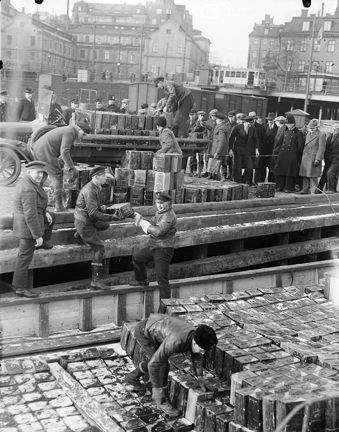 Smuggelsprit lossas vid Stadsgården. Spritbeslaget gjordes av polis och tull vid Sandskär, natten till den 10 mars 1930.