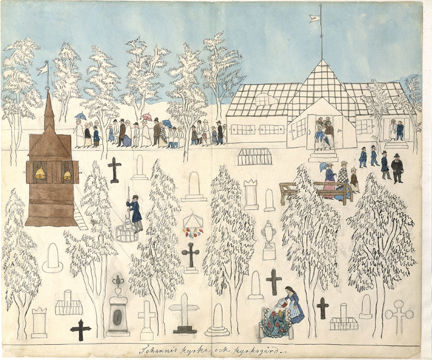 I Johannes gamla träkyrka, riven 1890-talet, har gudstjänsten just avslutats.
