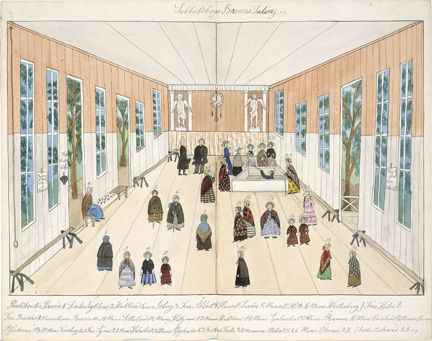 Vaktmästare Isberg häller upp vatten ur en långskaftad skopa. Alla deltagare på bilden är angivna med nummer ovanför sitt huvud. Josabeth själv har nummer 28.