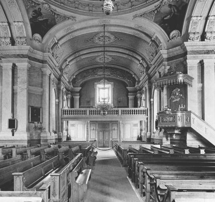 Interiör av Adolf Fredriks kyrka, mot ingången. Före restaureringen