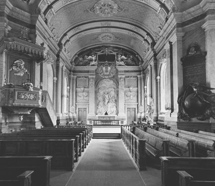 Interiör av Adolf Fredriks kyrka, mot altaret. Före restaureringen