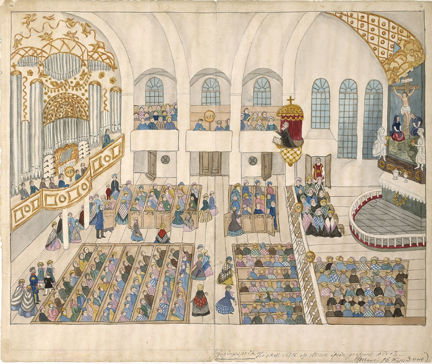 I Josabeth Sjöbergs kyrkointeriörer är det besökarna som är det realistiskt återgivna. Arkitekturen är inte så autentisk utan består av väl sammansatta minnesbilder.