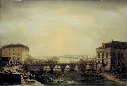 Målningen visar gamla Norrbro som var en gata över Helgeandsholmen med två broar. En bro gick från Gustav Adolfs torg på Norrmalm och en anknöt till Mynttorget i Gamla stan. Det är Mynttorget vi ser till vänster. Gamla Norrbro försvann i samband med att byggnaderna på Helgeandsholmen revs för att ge plats för byggandet av Riksdagshuset och Riksbanken. Detta skedde 1897.