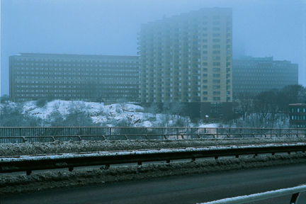 Marieberg sett från Västerbron. Till vänster bostadshusen ”Bacon-Hill” och ”Dragspelshuset” på Fyrverkarbacken och till höger SvD-huset.